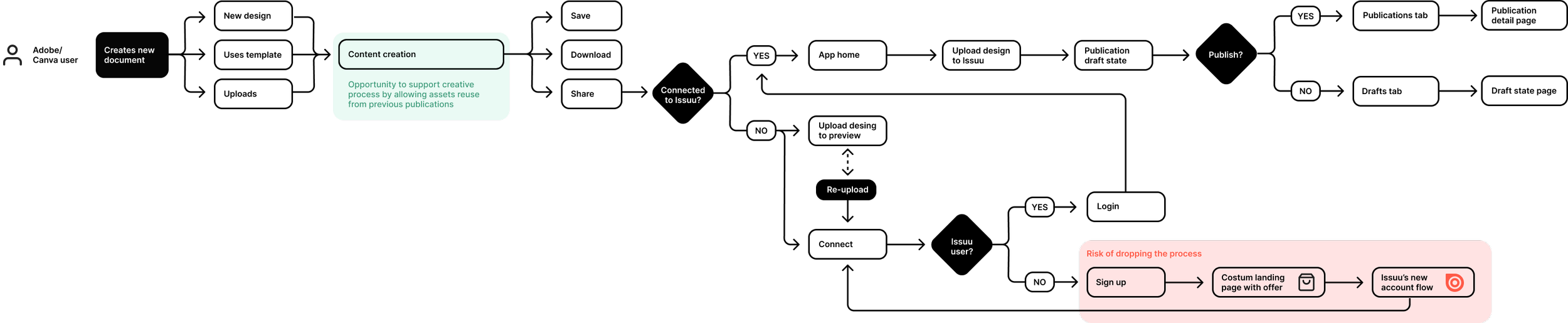 The discovery phase kicked off with deep research into user needs and workflows across Issuu and partners, focusing on:
